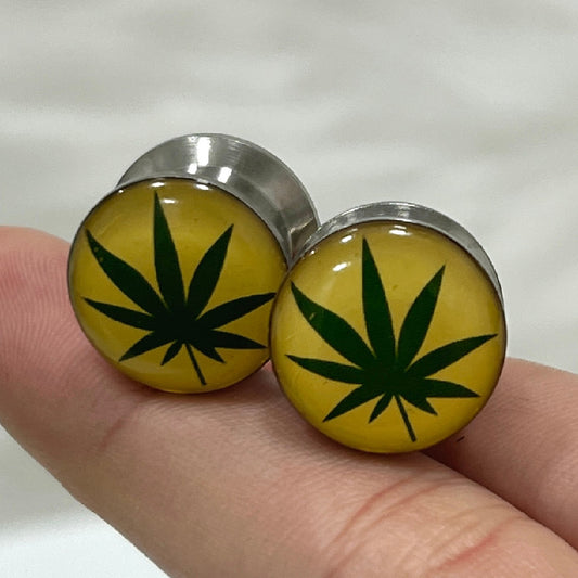 Surgical Steel Screw Fit Plug 4 to 1/2" Gauge With Pot Leaf Logo - Pair