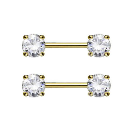 Surgical Steel Nipple Ring Barbell 14 Gauge Gold IP & CZ Gems Set