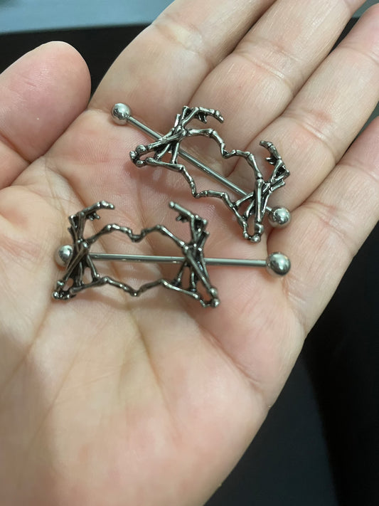 Surgical Steel Nipple Ring Barbell Shield 14 Gauge & Skeleton Hands - Pair