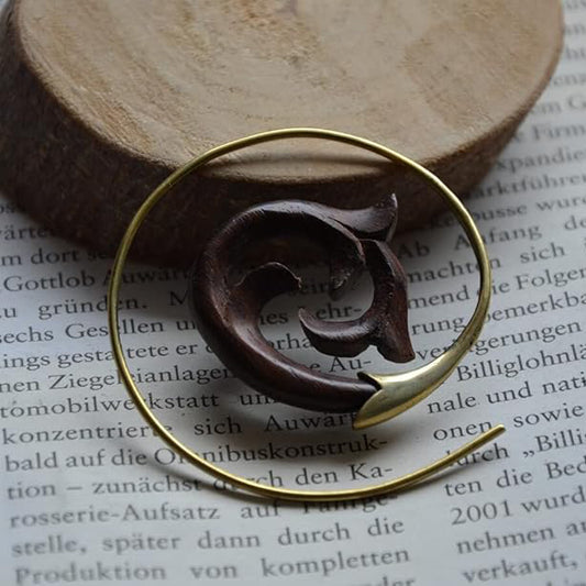 Brass Spiral Hoop Earrings 18 Gauge Carved Wood Tribal Dolphin - Pair