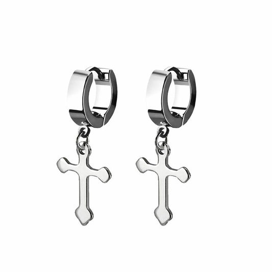 Stainless Steel Hinged Hoop Earrings 18 Gauge & Cross Dangle - Pair