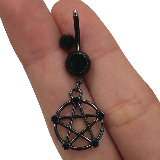 Surgical Steel Belly Button Ring 14 Gauge With Black Gem & Pentacle
