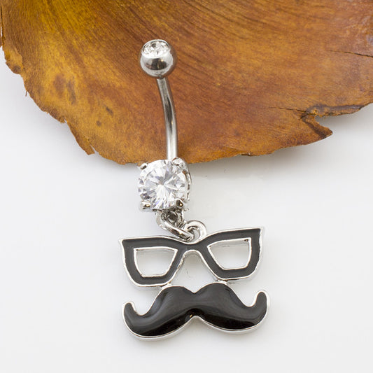 Surgical Steel Belly Button Ring 14 Gauge & CZ Glasses Mustache Dangle