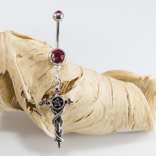 Surgical Steel Belly Button Ring 14 Gauge With Vintage Sword & Red Gem