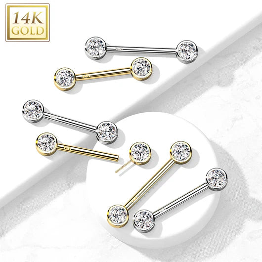 14 Karat Solid Gold Nipple Ring Barbell 14 Gauge & Threadless Round CZ