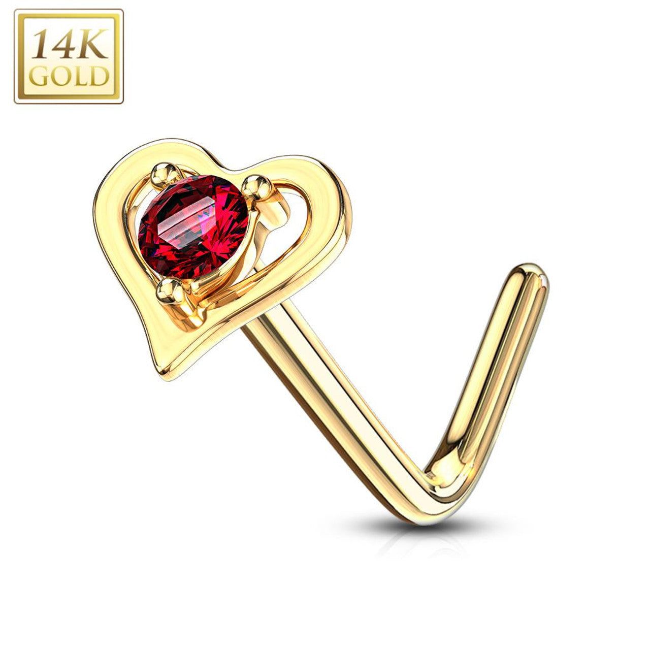 14 Karat Gold Nose Ring Stud 20 Gauge 1/4" L Bend & Center Gem Heart