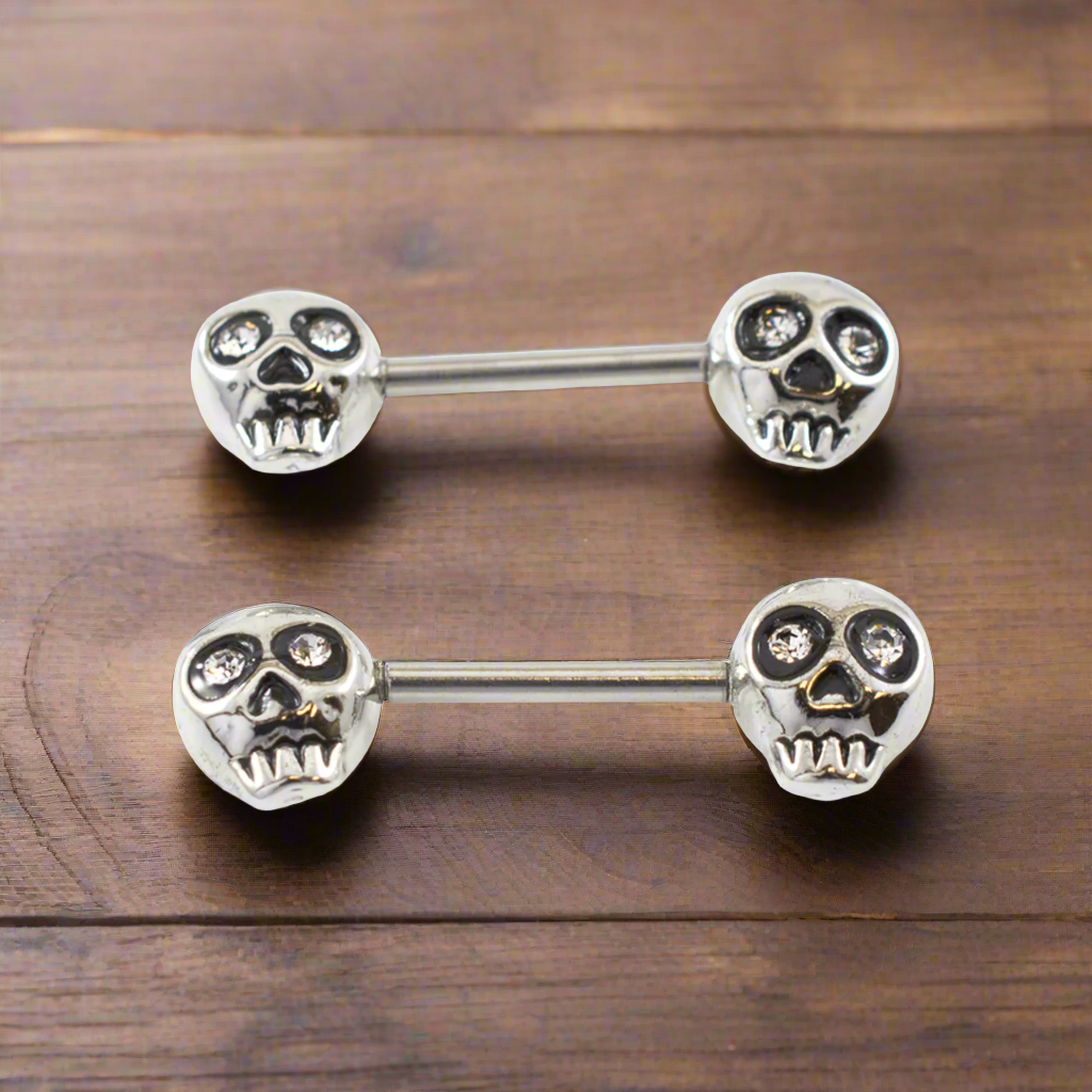 Surgical Steel Barbell Nipple Ring 14 Gauge & Skull Gem Eyes - Pair
