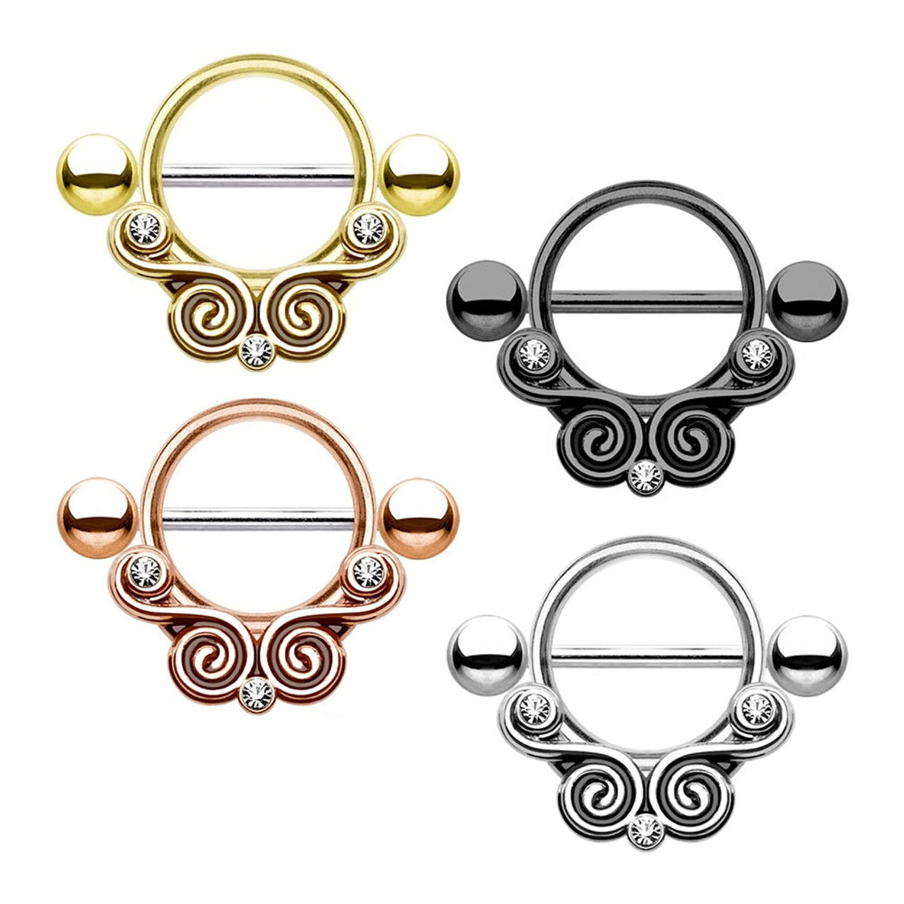 The design features delicate lace swirls adorned with clear cubic zirconia (CZ) gems, adding a touch of sophistication to your look. Available in a variety of colors—silver, black, gold, and rose gold—you can choose the one that best complements your personal style. The 5 mm balls enhance the overall aesthetic, making this nipple shield a standout piece. Sold individually, this jewelry is perfect for mixing and matching or as a unique addition to your collection. Whether you prefer a classic or contemporary vibe, the gem lace swirl theme offers timeless beauty that will not go unnoticed.
