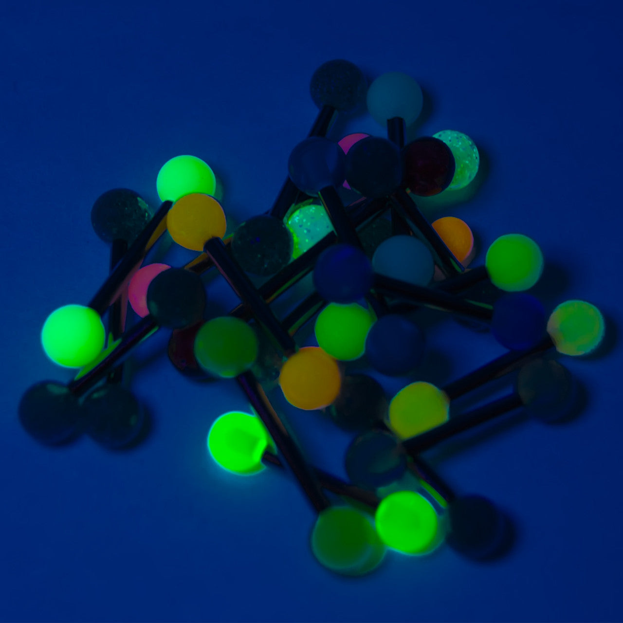 Elevate your piercing game with our Surgical Steel Tongue Ring Straight Barbell 12 Gauge Mix Bag - 20 Pack. Crafted from high-quality 316L Surgical Steel, these tongue rings are designed for durability and comfort. Each pack features a variety of ball end designs processed with UV glow, glitter, opaque, and clear finishes, adding a unique and vibrant touch to your jewelry collection. With a consistent 12-gauge (2 MM) thickness, these barbells offer a secure fit for a variety of piercings.